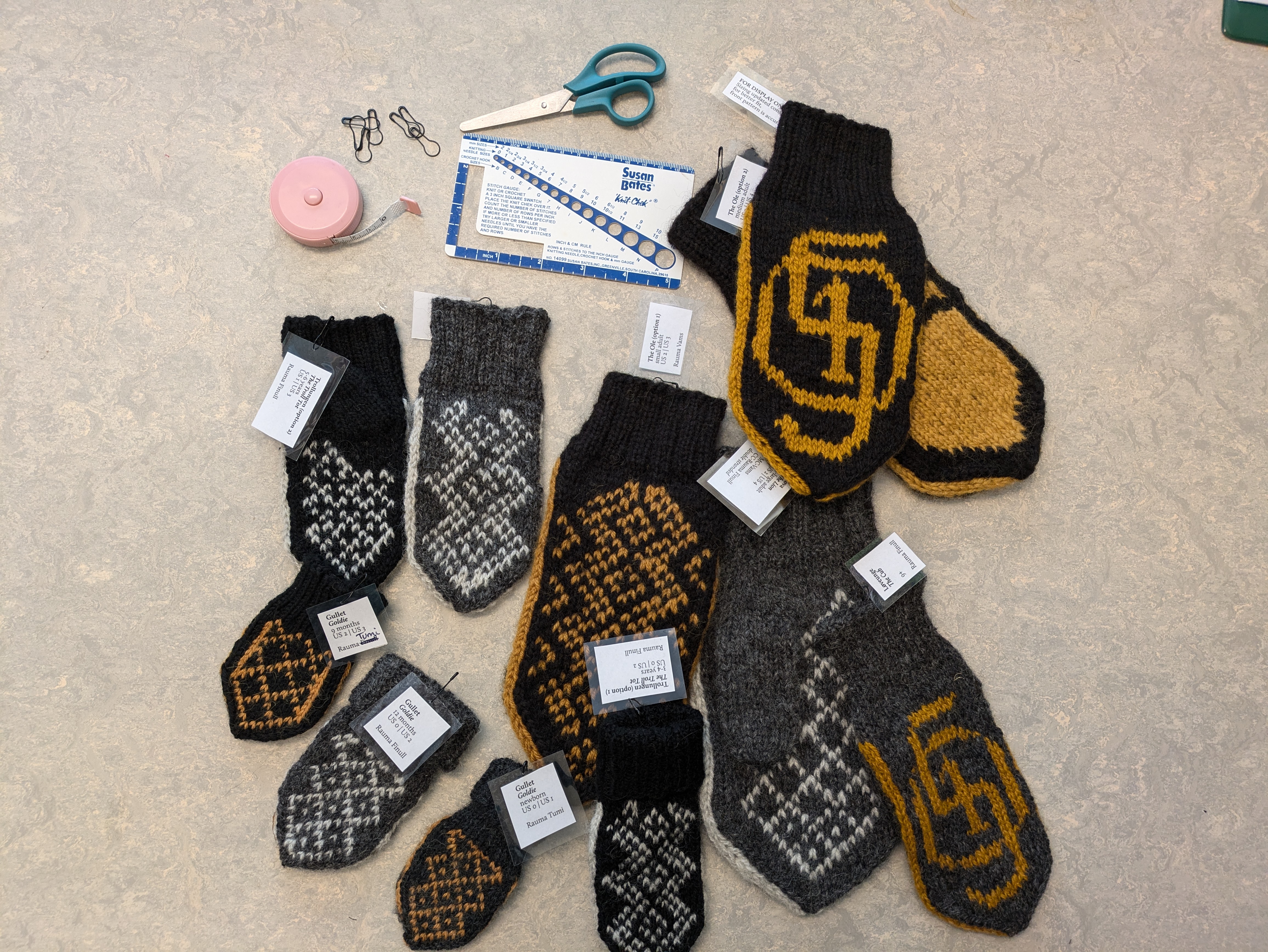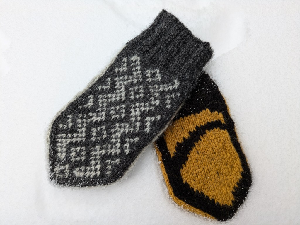The third of the St. Olaf College sesqui patterns is the Gullet (Goldie) which are two thumbless baby mitts, shield and O.